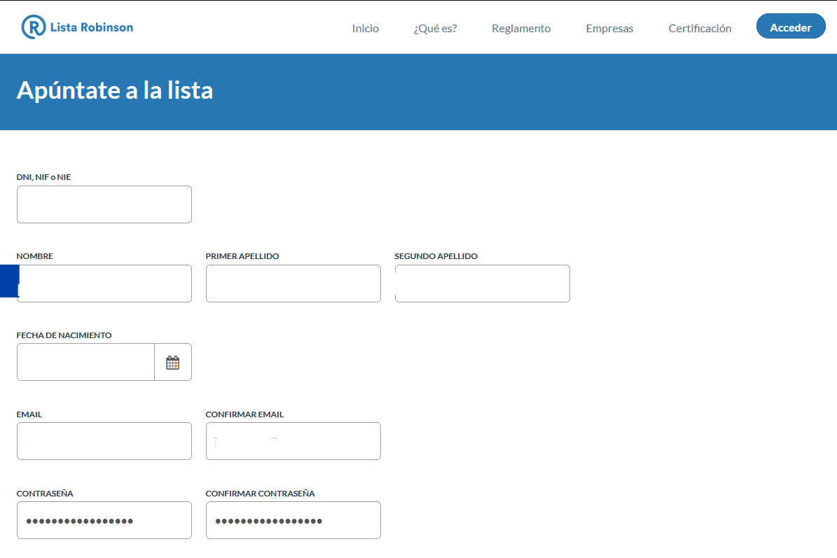 Para darse de alta es muy sencillo. Solo tienes que ir a la web de la lista Robinson y en el apartado de empresas registrar tu empresa rellenamdo el formulario de inscripción.