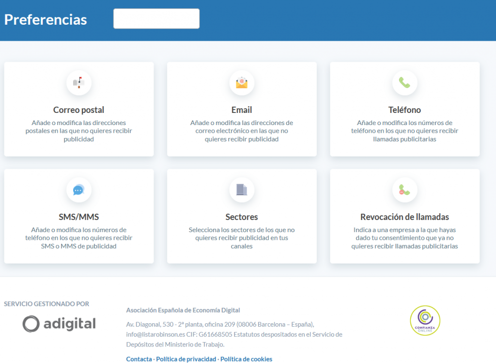 - Una vez dado de alta, puedes elegir la opción de preferencia para realizar la exclusión de los medios por los que no quieres recibir publicidad.
